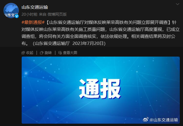 據(jù)山東省交通運輸廳官方微博消息,山東省交通運輸廳20日發(fā)布最新通報稱,針對媒體反映山東萊榮高鐵有關(guān)施工質(zhì)量問題,山東省交通運輸廳高度重視,已成立調(diào)查組,將會同有關(guān)方面全面調(diào)查核實,依法依規(guī)處理。相關(guān)調(diào)查結(jié)果將及時公布。